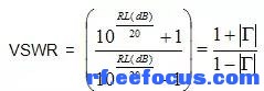 我们可以通过反射系数Γ或者回波损耗RL计算出VSWR,在这里我们列出了反射系数Γ 、回波损耗RL以及VSWR的计算公式: