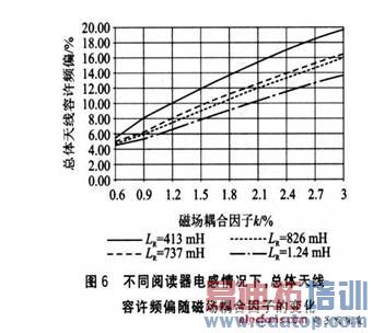 图6是当操作频率固定,阅读器电感为不同值时总的天线容许频偏随着磁场耦合因子k的变化曲线。从图6中可以看出,总体容许频偏随k的增大而增大,随阅读器线圈电感值的增大而减小。值得注意的是,天线电感与流过天线的电流成反比。对U2270B来说,最大天线电流(IRpp)被限制在400 mA。如果考虑到阅读器天线线圈的电压,天线的电感LR不能小于413 μH。在图6中,纵坐标总的天线容许频偏和横坐标磁场耦合因子对应着一个点,大于413/μH且小于在对应点之上最近曲线所对应的电感的任何电感值都可以被选取。确定了LR后,在工作频率固定的情况下,天线电容可以通过式(6)来计算:
