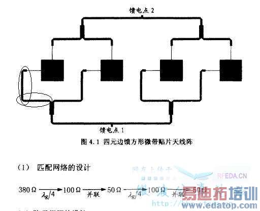 这是一双极化微带天线阵的设计。请问:天线输入阻抗经第一次四分之一波长变换后为100欧,然后通过一段微带线,并联后(圈出来的那段)能得到50欧吗?此段微带线会引起输入阻抗的变化啊。它的长度可以随便取吗?