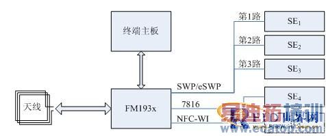 复旦微电子集团CLF芯片FM1930支持SWP、eSWP、7816、非接触通信、NFC-WI等多种SE接口模式,并且SWP和eSWP均为三路,可以非常好地支持一机通的概念。基于FM1930芯片的NFC终端作为一机通概念的卡片模拟应用时,其结构如下图所示: