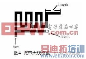 我们在设计时,考虑到微带天线应用在手持扩频通信设备中,要求天线具有剖面薄、体积轻、小型化的特点。根据上述公式计算出天线的实际尺寸,然后在AGILENT公司的电路和系统分析软件ADS上建模,仿真优化,得到图4所示的天线模型。该天线工作频率为2.4GHZ,尺寸为10MM×7.88mm,天线固定在尺寸为53mm×6.72mm的基板上,其材料选用FR4,相对介电常数为4.4,基板厚度为1.2mm。对贴片天线进行单点直接馈电,馈电点到贴片中心的距离为4.2mm,保证了天线体积的小型化。在馈线末端开出一个0.38mm的接地孔,以便和接地层相连。Length的长度与板厚有关系,板厚1.2mm,对应的Length长度为3.175mm。一体式结构适合大规模的生产和调试,并且坚固抗折,适合在卡状设备中使用。