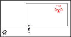 如图12所示的干扰环境中,干扰源是一个在"野蛮发送"的AP,干扰源出于一个房间之内和正常AP相距大约8m的范围,正常AP放置在房间的门口,STA和干扰源不可见,图11和图12传统天线和硬件智能天线在开启干扰源到关掉干扰源的情况下,吞吐量的变化曲线如图13、图14所示。从两个曲线中可以看出,智能天线整体性能在有干扰的情况下比传统天线少下降15%左右。