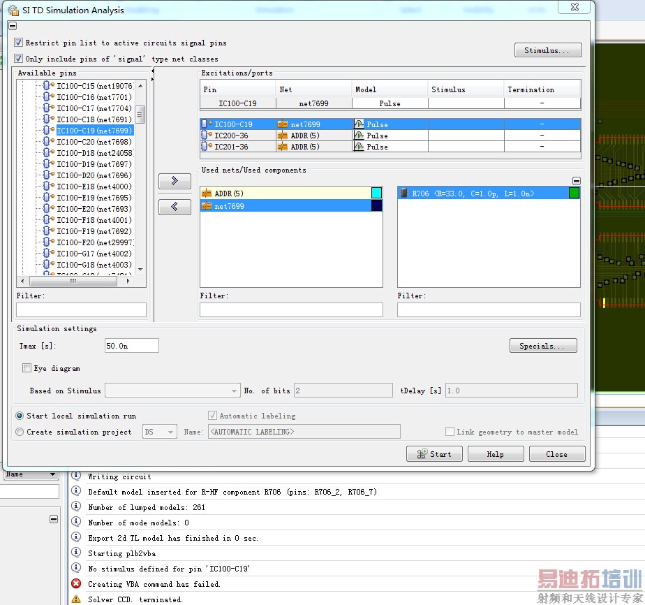 求助各位论坛大神!!最近在做本科毕业设计。有两个任务:仿真PCB 信号完整性和仿真得到眼图。由PCB 得到近场源,导入机箱仿真机箱的屏蔽效能。为了简单起见,我使用的PCB工作室自带SI模型。但是在做SITD仿真时,经常发生错误。