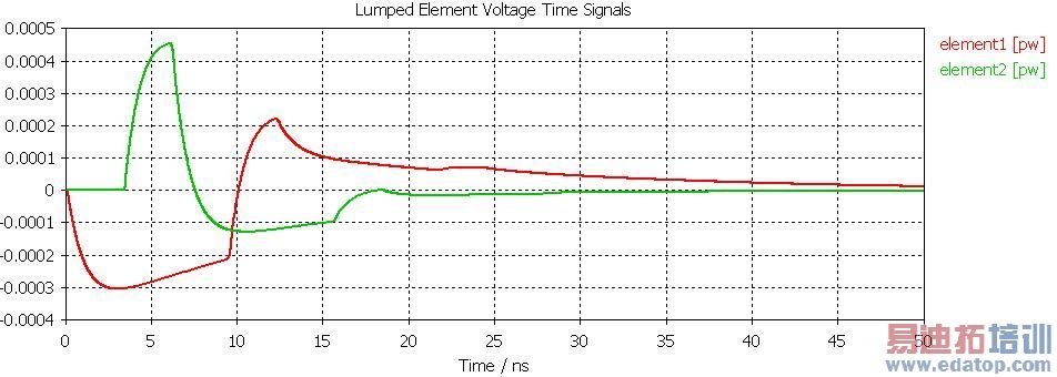 激励源用单位电磁脉冲,通过波导端口1和波导端口2辐照微带线,垂直极化方向。