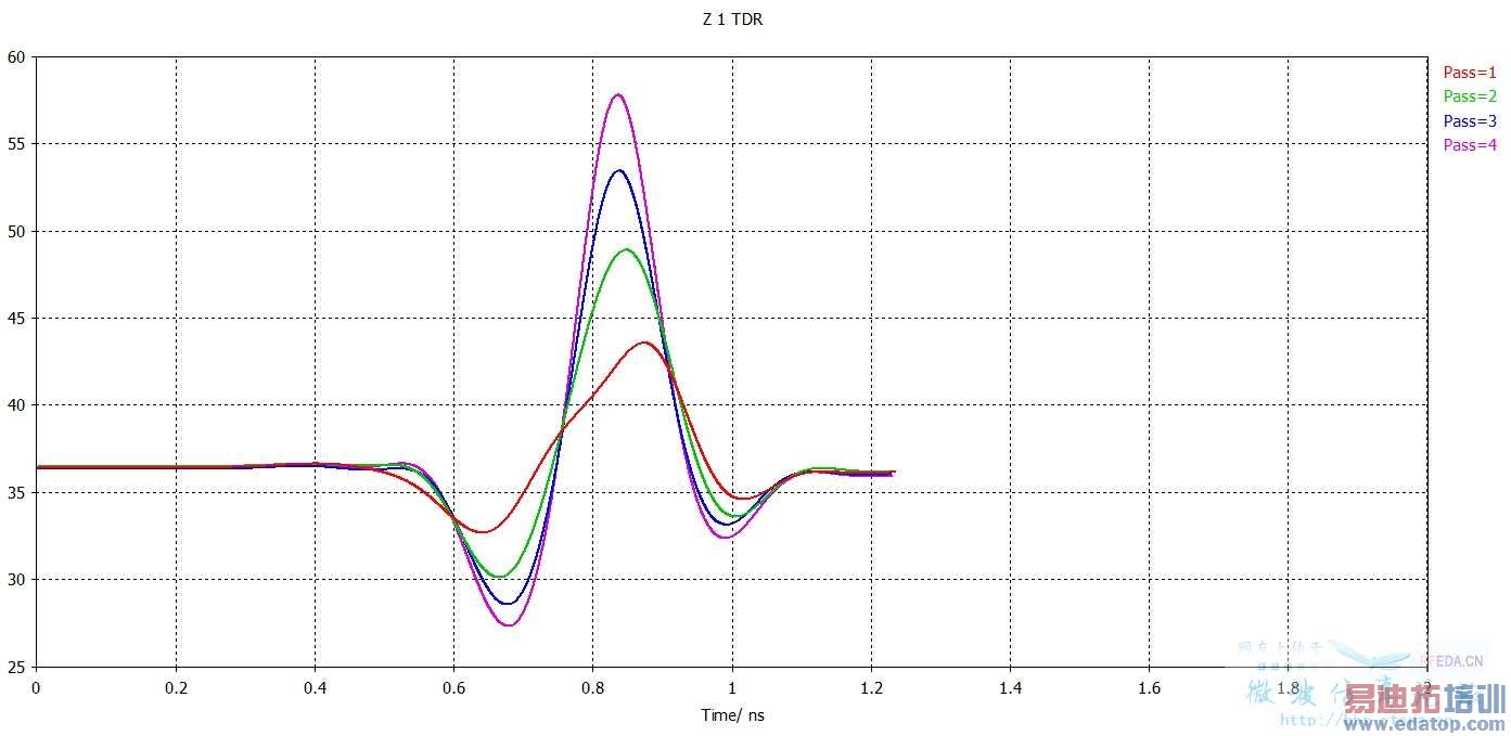1. 此例子的TDR阻抗不重合以我的经验是无法接受的,因为最高处会大到60欧姆,显然孔的阻抗没有这么大
