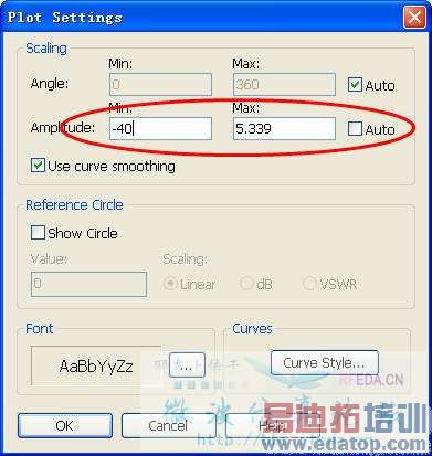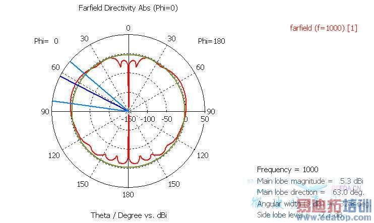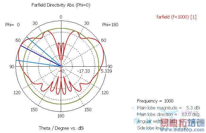 简单来说,就是调节显示的最大值和最小值,你看你自己的那个图,外围是角度,同心圆表示dBi增益,默认是50dBi到-150dBi,这个跨度很大,所以你的方向图看起来会很园很平滑,当按照hawk8969的方法设置后,将显示范围调整到5.339dBi到-40dBi,这样看起来就没那么平滑了,其实方向图还是没变的。