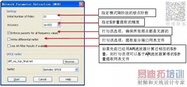 在菜单中选择 Result →NetworkParameter Extraction → Model Order Reduction…,打开MOR 网格参数提取对话框,如下图所示,完成设置,点击Start 提取网表文件。