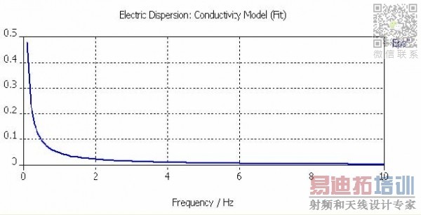 在弹出的相应对话框,输入频点及该频点上的损耗角正切值。这里输入的值符合f(x)=0.02/x 的分布,与电导率恒定比较符合,因此选择拟和方案为Conductivity