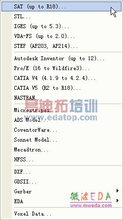 2) 导入三维文件 CST STUDIO SUITE™ 提供下列不同的 CAD 三维数据导入: ACIS SAT、STEP、Pro/E Release、CATIA、Autodesk Inventor、Agilent ADS files、Cadence Allegro / APD、Mentor Graphics ExpeditionTM PCB、Zuken CR-5000 Board Designer、ODB++/ODB++(X)、CoventorWare、IGES、VDAFS、STL ASCII、Voxel Data (Human Model)、Mecadtron、NASTRAN、HFSS。
