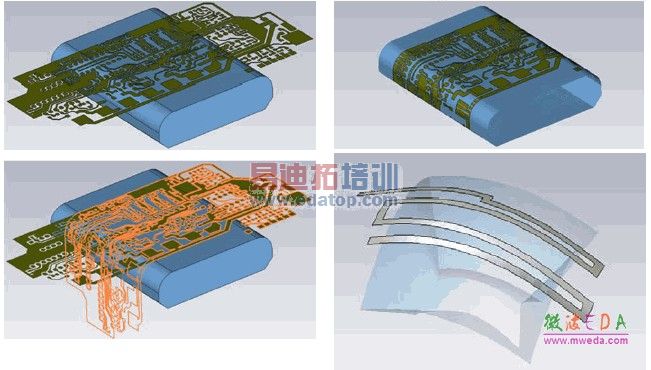 FPC柔性印刷电路可以一次性“紧密地”贴敷在物体表面上。被贴敷表面可以是单向曲率(上图)也可以是双向曲率(下图)的曲面。目前在手机天线、硬盘读写头信号线、PCB板与接插件互连中大多采用薄膜贴敷天线和柔性印刷电路。这样可以仿真高速差分对在弯曲状态下的信号完整性。