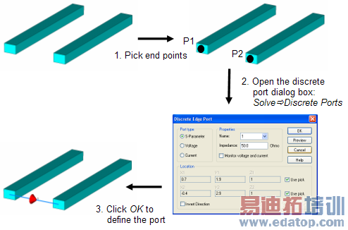 The typical way to define a discrete port is to pick its two end points from the structure using the common pick tools and then to enter the discrete port dialog box: