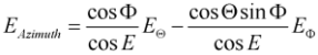 Ludwig 2 Azimuth over Elevation: The theta and phi components of the farfield can be transformed to the "Ludwig 2 Azimuth over Elevation" representation. Please note that this transformation is usually performed with the main lobe aligned to the z'-axis (see Farfield Plot - Axes and Vertical and horizontal polarization). Therefore, the phi and theta angles below refer to the main lobe aligned coordinate system. The azimuth and elevation component are calculated as follows: