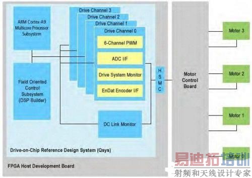 芯片实际上支持两项主要任务。第一项是在FPGA DSP模块中进行计算的现场定位控制(FOC)算法,实际上是每一电机大量的矩阵算术。可编程架构中的I/O电路以相对较低的速率和功耗,对位置数据进行解码,对信号进行编码,以便驱动电路板。第二项任务是功能安全封装,一组设计用于保护机器运行以及设备完整性的功能,运行在SoC FPGA的嵌入式ARM Cortex-A9 CPU上。