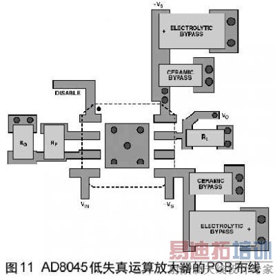 低失真引脚排列允许输出引脚(专用反馈引脚)和反相输入引脚之间可以靠近连接,如图11所示。这样极大地简化和改善了布线。