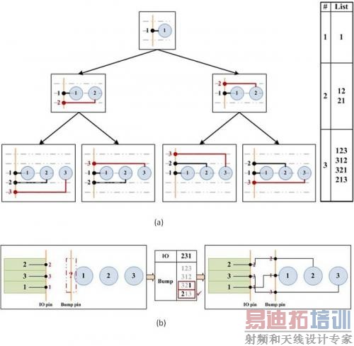 图8:凸点选择算法。(a)产生可移动的引脚顺序。(b)选择可尽量减少可移动引脚和I/O焊盘间交叉连接的引脚顺序。