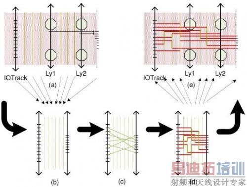 图6:这个简单例子解释了布线流程:(a)区域性层分配,可移动引脚的分配以及版图抽取。步骤(b)和(d)描述了使用哪根线以及使用通道布线完成从I/O焊盘到引脚的布线。(e)展示了重新映射进原始版图的布线结果。