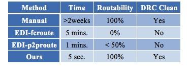 上述框架结构已经在一个大规模的商业项目中实现。首先,芯片被分为4个区:W、N、E和S。每个区包含100个以上的信号凸点。针对每个区,我们的布线器可以在不到5秒的时间内产生结果并完成命令脚本的下载。通过在Encounter Digital Implementation (EDI)中提交这些脚本就完成了物理布线。这个结果也可以用任何引脚至引脚布线器实现,因为所有引脚位置都分配好了。设计规则检查(DRC)判断所有结果都是好的。布线结果见图6和图7,同时总结在表I中,其中fcroute是在所定义的EDI中的倒装芯片布线器,p2proute是点到点布线器。由于没有签署披露协议,因此只显示了部分结果。