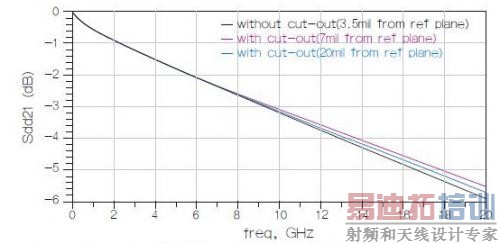 图4和图5分别显示了仿真得到的TDR和插损图。参考平面没有裁剪的SMT设计造成的阻抗失配是12Ω,插损在20GHz时为-6.5dB.一旦对SMT焊盘下方的参考平面区域进行了裁剪(其中"d"设为10mil),失配阻抗就可以减小到2Ω,20GHz时的插损减小到-3dB.进一步增加"d"会导致条状电感超过电容,从而引起电感不连续性,转而使插损变差(即-4.5dB)。