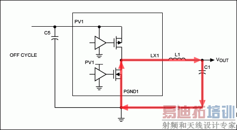 MAX20021同步整流DC-DC转换器每路输出的开关电流路径上具有三个无源器件(C1、C5、L1)。这三个元件对电磁辐射和器件性能的影响非常大。图1、图2所示为OUT1在ON/OFF期间的开关电流路径;图3为两个电流路径的差异,具有最大di/dt.应优先考虑C5的布线,其次是L1和C1布线。