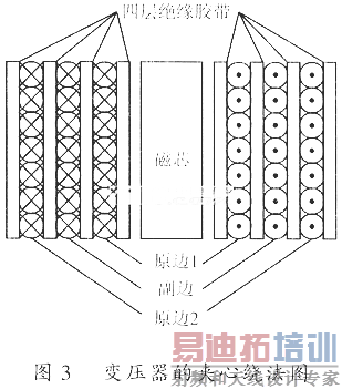 为了尽可能地减小变压器的电磁噪声,就要使其原边绕组和副边绕组的耦合系数尽可能接近1,从而减小漏磁通,达到减小漏感的目的。这就需要在变压器的设计上下功夫,使原边绕组和副边绕组尽可能地靠近,同时和磁芯也要尽量靠近,这样漏磁通就会减到最小。根据这个原则,最好的绕法就是原边和副边交叉并绕,这样能达到使漏电感最小的目的。但是在实际应用中,变压器还要考虑原副边之间的高压隔离,所以实际当中更多应用的是"三明治"的夹心绕法(如图3所示),即绕一层原边,绕一层副边,再绕一层原边,或者一层副边,一层原边,最后一层副边,这就能使原副边之间的耦合更好,减少漏感,减少由于漏感引起的电磁感应噪声。(设计导线线径的时候,除了应当考虑通过的电流大小和趋肤效应之外,还应当力争让导线将每层都铺平,而不要出现稀疏的两三匝的现象,只有这样,原副边的耦合效果才能进一步提高)。图4给出了实验波形图,从图4可知,用夹心绕法绕制的变压器,MOSFET上的振荡小了很多。