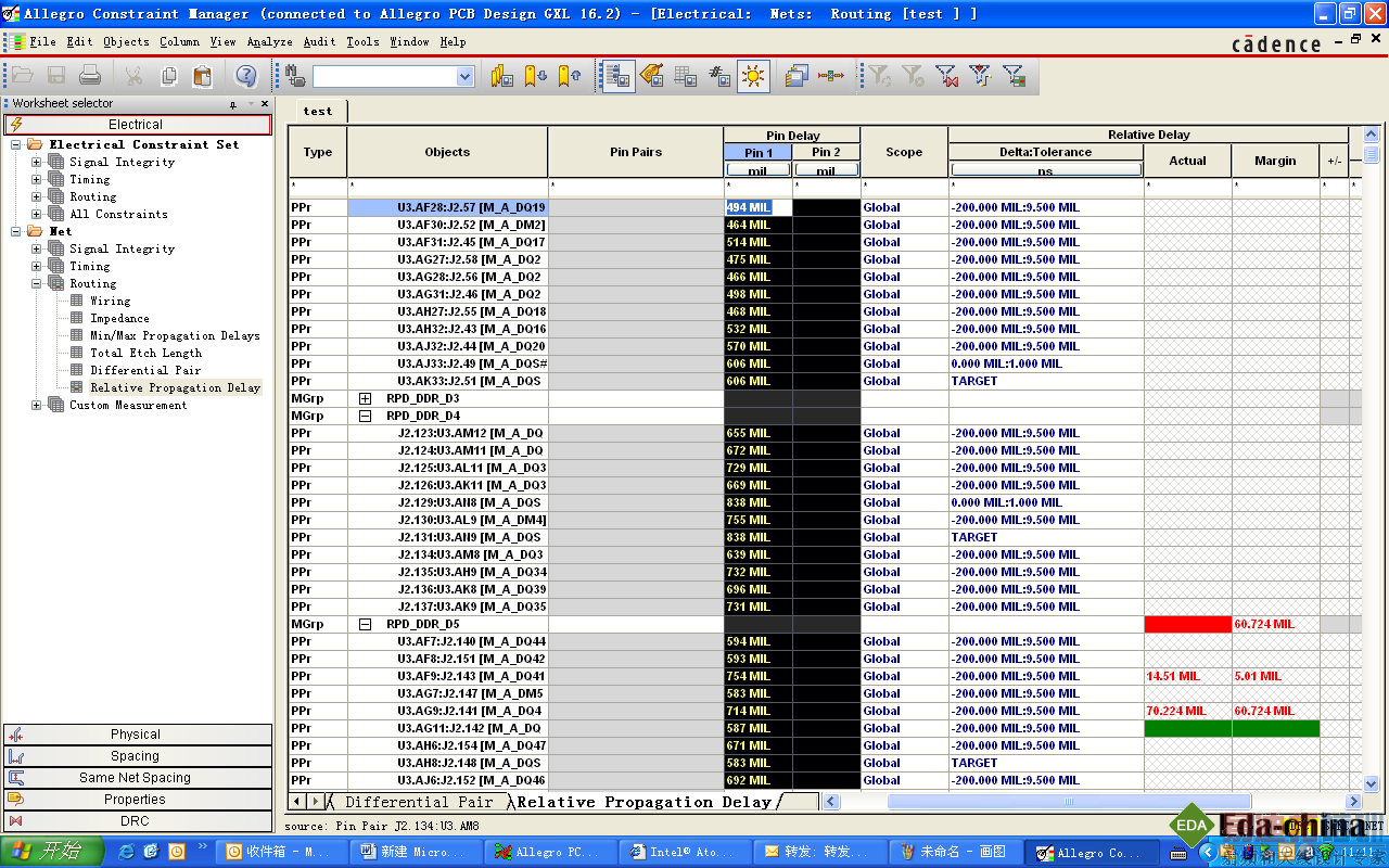 注意: 一定要将芯片封装内部的绕线长度计算在内, 绕线长度参数可以从芯片封装厂商获取,输入ConstraintManager中,来驱动布线处理.
