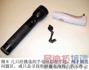 无论你是做焊接、测试,或只是把一只器件从卷带中取出,都要能够看到微小的器件。首先,确认你的工作区有充足的照明。在适度的电力价格下,电子镇流器式照明有良好的总体照明效果。你也可能希望用卤素射灯或装在反射罩内的微型荧光灯,用于工作区的局部照明。装在台面上的铰接灯也可用(图A),手边还要有几支不同尺寸的手电(图B)。你经常会在调试时向机壳里看,一把小手电能让你看清内部状况。现在还有能装在眼镜框上的手电,以及很多可以戴在头上的传统医用灯。如果你需要趴在某些设备下面调试自己的原型,这些能腾出双手的灯就特别有用。