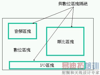 「安静区域」是和数字电路、模拟电路、供电和接地平面隔离的区域。这种隔离可以避免其它PCB区块内的噪声源,破坏了敏感电路。例如:来自数字区块的供电平面噪声,渗入至模拟装置(模拟区块)、音频装置(音频区块)、I/O滤波器、互连电路…..等的供电接脚,如附图一。