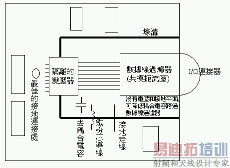 这是使用隔离的变压器或光学隔离器来达成的。一个I/O区域必须与PCB的其它部位100%隔绝。只有在金属的I/O连接器上,射频讯号会和底盘的接地平面结合,而且只有透过一个低阻抗、高质量的保护路径来接地。此外,必须将底盘的接地平面和这个隔离区域分开。有时由于设计的需要,必须在I/O缆线的屏蔽接地(或编织隔离)至底盘接地之间使用旁路电容,以取代直接连接。屏蔽接地或泄漏线路(drain wire)是指在接口连接器上的一根独立接脚或线路,和外部I/O缆线的内部泄漏线路与它的聚酯薄膜(mylar foil)屏蔽相连接,聚酯薄膜屏蔽也位于该缆线内部。在任何情况下,都不能使用尾导线(pigtail wire)将BNC连接器的外层与底盘的接地面或任何接地系统 连接在一起。测量结果显示,同样在15至200MHz范围内工作的两个射频讯号,一个在尾导线内传输,另一个在对BNC连接器外层做360度连接的缆线屏蔽内传输,它们之间会有40至50dB的误差。这除了可以降低射频辐射以外,同时也可以提高ESD的免疫能力,因为当发生ESD时,它的导线电感值比较小。对大多数应用而言,最好能将缆线屏蔽连接至BNC连接器外层,并且做360度的连接。这个连接器后盖(backshell)最后和一个隔离壁(bulkhead)面板结合,此隔离壁包含了一个金属面,可以和底盘的接地面连接。