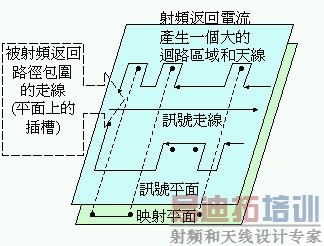 附图六说明了映射平面被不正确地使用的情形。这些平面现在已经无法成为一个固定的0 V参考点,以去除共模的射频电流。由于平面的切割所造成的损失,最后可能会产生射频电场。在一个映射平面上的通孔(via)并不会减弱该平面的映射能力,但接地插槽(ground slot)除外。