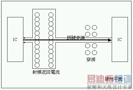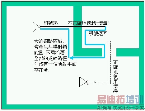 如果一条讯号走线是沿着穿洞区域(不连续区域)行走,则一个固定的映射平面(射频返回路径)将会沿着所有的讯号路径存在着。在附图七右侧,因为接地平面没有不连续,所以走线长度可以缩短。相反的,在附图七左侧,如果走线长度增加,就会增加电感值。当走线长度增加后,会造成能量反射,破坏讯号的完整性和应有的功能,也会产生射频电流回路,如同天线一样。