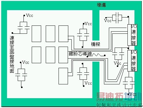 PCB上的走线绕线必须控制好,以免再次耦合的射频电流流入缆线的屏蔽(shield)内。一个干净的(安静)接地必须位于全部缆线离开系统的点上。供电和接地平面必须同等对待,因为这两种平面都是射频返回电流的可能路径。从交换装置到I/O控制电路的射频返回电流,会将高频宽的交换式射频噪声带至I/O缆线和互联机路中。