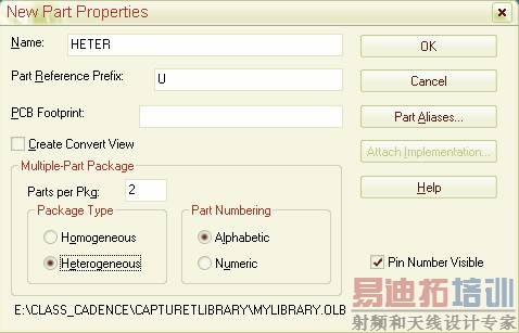 1、 选中.olb文件,右键new part,弹出new part properties对话框,填入元件名称,Parts per package填入2,package type 选Heterogeneous。如图