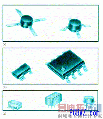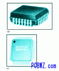 图一 常见的封装型态 (a)四支引脚的圆形封装;(b)SOP; (c)金属封装;(d)J型引脚的QFP;(e)L型引脚的QFP
