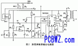 加电→R32,R33分压→经R2给C2充电→V5导通→SGl524的10脚电位降低→SGl524工作,输出脉冲。