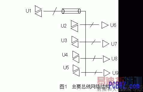 图1为该板设计的主要总线网络结构,该板为系统中一主要的单板,数据总线、配置总线及使用的元器件很多,使得该板的密度较高。总线等网络的数据都是双向传输,且是点到多点,该板采用八层板结构,两层电源、地,六层信号。