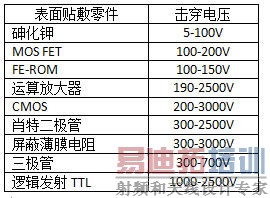 ESD引起器件的击穿:硬击穿,一次性造成芯片介质击穿、烧毁等永久性损坏。软击穿,造成器件性能下降或参数指标下降而成为隐患。 常用表面器件的击穿电压:(如下图)