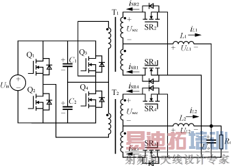 图3为对称半桥倍流整流拓扑,两个输出滤波电感的电流相位相差180°,与双通道交错并联拓扑存在相似的电感电流纹波互消作用,对应D=0.5时,可以实现完全的电流纹波互消作用(输出电流纹波为零)。在应用于负载对动态响应要求不高的场合时,可以把稳态占空比选定为0.5,从而大大减小输出滤波器的体积。但对于数据处理器这类对动态响应有较高要求的负载时,不能把0.5这一满占空比作为稳态占空比。但当D偏离0.5时,其纹波互消作用则会大大削弱,限制了输出滤波器参数的取小,降低了功率级的能量传输速度。在这种情况下利用交错并联技术,把两个对称半桥倍流整流拓扑进行交错并联,如图4所示,则可实现与四通道交错并联QSW电路相似的纹波互消作用(Dmax<0.5)此时,若把稳态占空比定在0.25,则可实现稳态时完全的纹波互消作用,输出滤波电感也可以取得很小,从而在负载突升(D:0.25→0.5)和突降(D:0.25→0)时,具有对称的快动态响应。