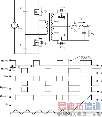 如图所示,让对称半桥全波整流电路按照QSW方式工作,在所有负载范围内电感电流都从正到负变化,则可实现原边开关管在开通之前,电感电流反映到原边,流过即将开通的开关管的体二极管,实现ZVS。而且在负载突升时,输出滤波电感的等效占空比可达到100%,整个周期都会有正压加在输出滤波电感上,来提升电流;负载突降时,滤波电感的等效占空比可以为0%,整个周期都会有负压加在电感上,来降低电流。具有与单通道QSW电路相似的动态响应特性。应用交错并联技术,把两个对称半桥全波整流电路并联起来(如图2所示),取稳态占空比为0.5,可实现完全的输出电流纹波互消作用,大大减小输出滤波器 , 在负载突升和负载突降时,具有对称的快速动态响应。