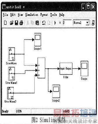 打开Simulink新建一个文件untitledl如图2,在FDATool界面中点击Realize Model,将设计好的滤波器模型导入Simulink中,然后添加三个频率分别为50Hz、250Hz、350Hz的正弦波,利用Scope见察通过数字低通滤波器Filter的滤波效果。