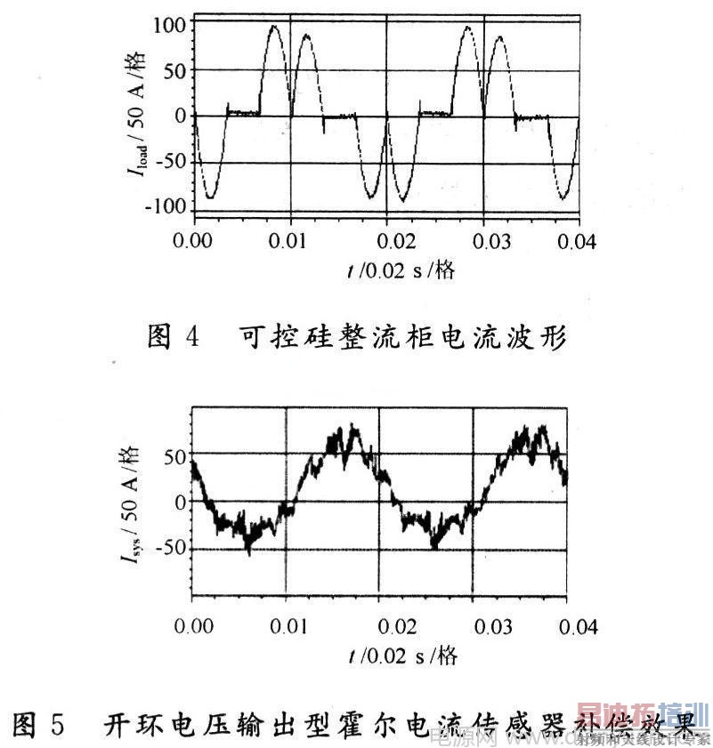 实验分别对开环电压输出型霍尔电流型传感器和闭环电流输出型霍尔电流传感器做比较分析,运行样机,得出以下不同的补偿效果。图4为可控硅整流柜开启时的负载电流Iload。,其中横坐标为时间,单位为秒,纵坐标为电流,单位为安培,可以看出该电流含有大量非基波成分,经过专业仪器分析,该电流含有大量的5 次和7次谐波,这也印证了可控硅电路的谐波含有特点。为样机安装电压输出型霍尔电流传感器,测量Isys对可控硅整流柜的补偿效果如图5所示,可见结果中电流趋于正弦,但仍含有很多毛刺,经过专业工具分析,发现电路中虽然5次和7次谐波明显降低,但是出现了部分偶次谐波,而这些待补偿电流中原来没有,说明这些电流是由有源滤波器发出的,而发出这些电流的原因归咎于信号传递过程中的干扰,这些噪声信号通过低通滤波器后仍然留有部分频率较低信号,参与运算后得到了这样的结果。