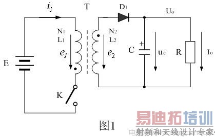 这里我们以反激式开关电源的工作原理为例,详细分析开关变压器伏秒容量的应用。图1是反激式开关电源的工作原理图,目前70%以上的小功率开关电源都是采用反激式开关变压器输出电源。所谓反激式开关变压器输出电源,就是当开关变压器的初级线圈正好被直流脉冲电压激励时,开关变压器的次级线圈没有向负载提供能量输出,仅在开关变压器初级线圈的激励电压消失之后,开关变压器铁芯中存储的磁能量才通过次级线圈转化成反电动势向负载提供功率输出,这种开关电源称为反激式开关电源。