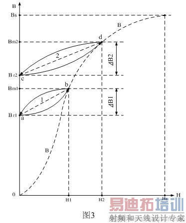 图3中,当磁场强度由0增加到H1,对应的磁感应强度也由Br1沿着磁化曲线ab增加到Bm1;而当磁场强度由H1下降到0时,对应的磁感应强度将由Bm1沿着磁化曲线ba下降到Br1。如果不考虑磁通的方向,磁通的变化量就是⊿B1 ,即磁通增量⊿B1 = Bm1-Br1。