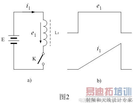在图1中,当输入电压E加于开关变压器初级线圈N1的两端时,由于开关变压器次级线圈产生的电动势与流过二极管的电流方向正好相反,相当于所有次级线圈均开路,此时开关变压器相当于一个电感L1 。其等效电路如图2-a) 所示,图2-b) 是开关接通时,电感两端的电压和流过电感L1的电流。