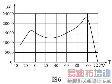 铁氧体变压器铁芯在常温下,虽然电阻率很大,但当温度升高时,电阻率会急速下降,使涡流损耗增加;当温度升高到某个极限值时,变压器初级线圈的有效电感量几乎下降到0,相当于导磁率也下降到0,或相当于变压器次级线圈被短路,此时的温度称为居里温度,用Tc表示。因此,铁氧体的电阻率和导磁率都是不稳定的,我们对开关变压器进行设计时,工作温度最好不要超过110℃。图6是日本TDK公司高导磁率材料H5C4系列铁芯初始导磁率 随温度变化的曲线图,其居里温度Tc大约为120℃。