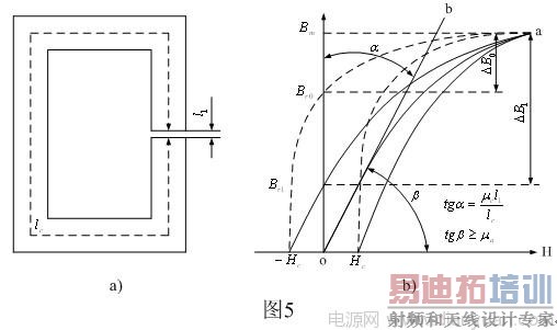 由于导磁率的变化范围太大,且容易饱和,因此,一般开关电源使用的开关变压器都要在开关变压器铁芯中间留气隙。图5-a) 是中间留有气隙的开关变压器铁芯的原理图,图5-b) 是中间留有气隙的开关变压器铁芯的磁化曲线图,及计算开关变压器铁芯最佳气隙长度的原理图。