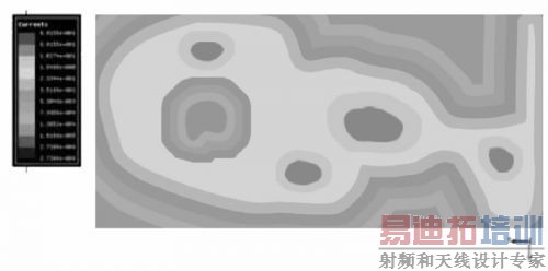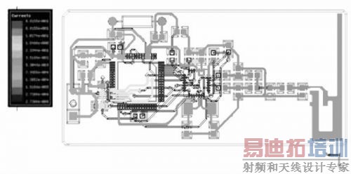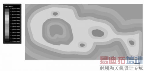 通过在Ansoft Designer中过对以上10个频点的扫描,即可得到了PCB的电流图和近场分布图,这里以50 Hz点为例,分析得到的电流图,E、H近场分布图进行分析,如图3、4、5可见,电路中出现4块场强较强的区域,分布在2个晶振及射频发射电路区域,其中晶振区域存在着敏感元件,而这部分正好辐射强度较大,这对于PCB的电磁兼容来说是不合适的。