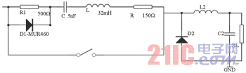 在开关控制电源的输入部分加入缓冲电路(见图3),其由线性阻抗稳定网络组成,用于消除电力线干扰、电快速瞬变、电涌、电压高低变化和电力线谐波等潜在的干扰。缓冲电路器件参数为D1为MUR460,R1=500Ω,C=6nF,L=36mH,R=150Ω。