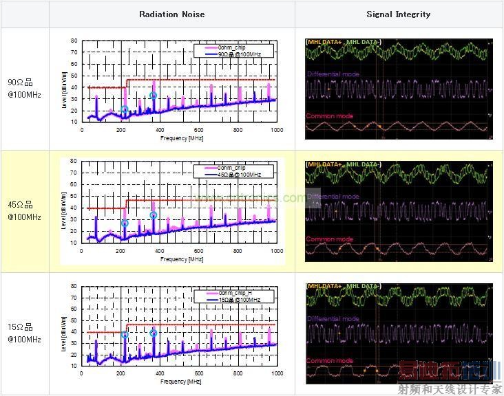 使用共模扼流线圈时的静噪效果及信号波形评测图5显示的MHL信号线使用各种共模扼流线圈时的辐射噪声/信号波形评测结果。共模扼流线圈在产生噪声的30MHz~1GHz频率段内,按照阻抗由高到低的顺序,分别使用以下3种类型(90Ω、45Ω、15Ω@100MHz) (静态特性请参考图6) 来进行测量。