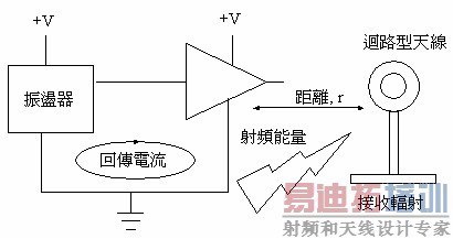 在附图二中,一个电路包含有一个频率源(振荡器)和一个负载。我们可以看到有一个回传电流(return current),在此电路沿着封闭回路流动着。这个封闭回路是由PCB走线和射频电流的回传路径组成的。我们可以利用仿真软件,来建立此讯号走线的模型,并评估此模型所产生的辐射电场。此回路所产生的电场是下面四个变量的函数。