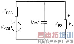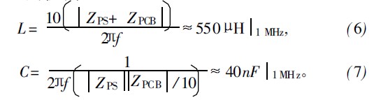 第1步应选定滤波器拓扑结构。常用阻抗匹配的拓扑结构有4种,分别是并联电容、串联电感、L-C回路和C-L回路。ZPS和ZPCB的阻抗都在几十欧至几百欧间,若采用并联电容拓扑结构,并联电容的值要远小于ZPS ||ZPCB的并联电容,若采用串联电感拓扑结构,串联电感的值要远大于ZPS+ZPCB的串联电感,按并联电容和串联电感拓扑结构分别估算出C和L的值为: